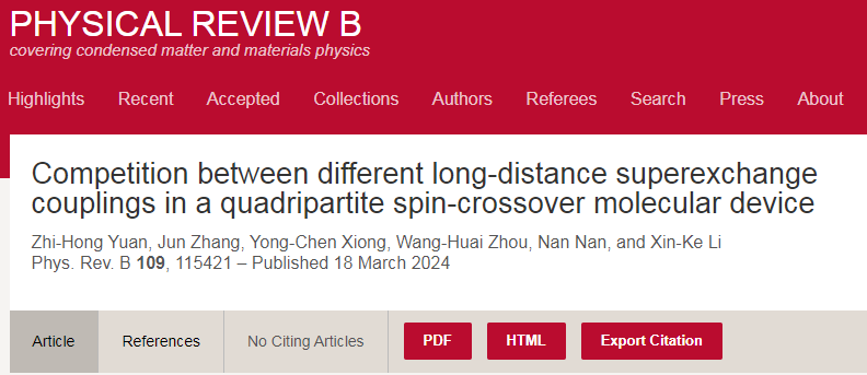 近日,凝聚态物理旗舰期刊Physical Review B(Phys. Rev. B)在线发表了公司数理与betway西汉姆联官方网站微纳结构与量子器件团队题为“Competition between different long-distance superexchange couplings in a quadripartite spin-crossover molecular device”的研究成果。论文的第一作者是数理与betway西汉姆联官方网站光学工程专业22级研究生袁志鸿。微纳结构与量子器件团队负责人熊永臣教授和周望怀副教授为论文的共同通讯作者,张俊副教授、南楠副教授、李新克博士参与了该项研究。量子信息与精密光学十堰市重点实验室、数理与betway西汉姆联官方网站为第一通讯单位。