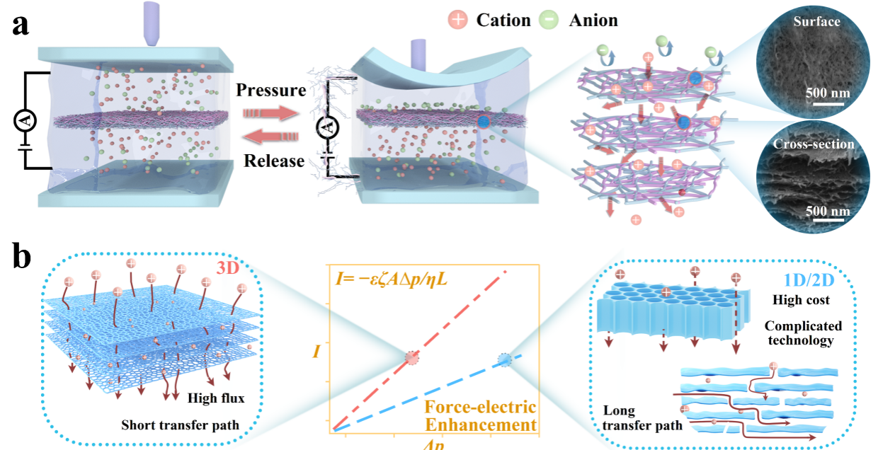 传统纳米流体膜在选择性和渗透性的固有“权衡效应”限制了其在力-电转换性能的进一步提高。为克服这一局限,我们利用芳纶纳米纤维/纤维素纳米纤维(ANF/CNF)双交联技术开发出了一种具有高机械强度的三维网络结构纳米流体膜。借助于CNF拥有丰富的表面官能团和高电荷密度及ANF优异的机械强度,这种大规模集成的三维纳米流体膜呈现出高通量、高孔隙率以及短离子传输路径等优势,克服了一维通道在可扩展性方面的局限以及二维通道所特有的迂曲离子传输路径问题,同时实现了高选择性和高渗透性。并通过实验结果和理论计算对ANF/CNF膜的力-电增强机理进行了系统的研究。基于三维ANF/CNF纳米流体膜的压力传感器件灵敏度为111 nA cm-2kPa-1,响应/恢复时间为63/68 ms,循环稳定性高达45,000次。该工作促进了无源线性力传感器的发展,推动了其在人工智能、物联网、智能可穿戴设备等领域的潜在应用。