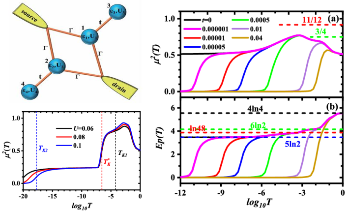 四杂质Anderson模型为实现量子信息和量子计算所需的可扩展量子处理器提供了有力的工具。有着优异的量子输运特性。但长期以来,学术界关于四杂质Anderson模型中的多级磁矩屏蔽研究很少。团队基于四苯基卟啉镍(Ni-TPP)分子异构体,构建了四杂质Anderson模型,通过改变在位库伦排斥势U和点间跳跃积分t,系统出现了多阶磁矩屏蔽的现象。