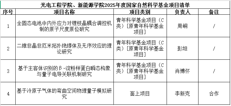 8月27日,国家自然科学基金委员会发布了“关于2025年国家自然科学基金集中接收申请项目评审结果的通告”。截止目前,betway西汉姆联官方网站、新能源公司教师共斩获国家自然科学基金项目4项,其中青年科学基金项目3项,包括周峒博士申报的《全固态电池中内外应力对锂枝晶耦合调控机制的原子尺度原位研究》项目、彭坦博士申报的《二维非晶非厄米拓扑绝缘体及无序效应的理论研究》项目、肖博怀博士申报的《基于主客体识别的β-淀粉样蛋白瞬态构象与量子电导关联机制研究》项目;以及面上项目1项,为李新克博士与西安交通大学联合申报的《基于冷原子气体的弯曲空间物理量子模拟研究》项目,实现了近年来公司国家级项目的最好成绩!