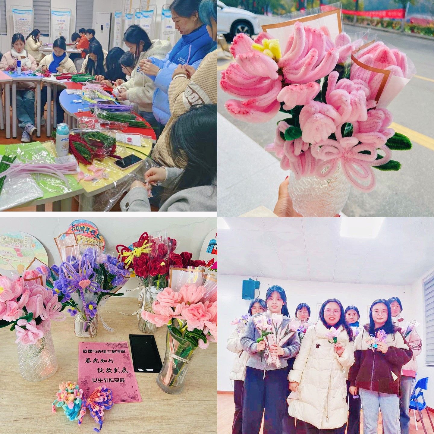 在活动现场,工作人员提前将准备好的“扭扭棒”、花艺胶带等工具摆好,随后由公司女生部员工干部做示范讲解。伴随着欢声笑语,女生们天马行空充分发挥自己的想象力开始创作手工艺品,这些纤细的扭扭棒在心灵手巧的女生手里尽情舞动起来,在大家的共同努力下,一朵朵美丽的扭扭棒花束如约而至,平平无奇的扭扭棒变成了一朵朵明艳动人的百合花、郁金香,大家都收获了独属于自己的“春天”。还有的同学制作出了栩栩如生的蝴蝶,可爱的拖鞋…大家将自己的情感、理想都细细地揉进作品中,引得同学们纷纷赞叹不已。