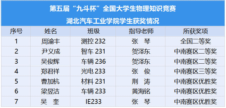 近日,第五届“九斗杯”全国老员工物理知识竞赛获奖名单揭晓。汽院学子首次参赛,在数理与betway西汉姆联官方网站大学物理教学团队的精心指导下,经过初赛、复赛和决赛三轮激烈角逐,取得了优异成绩,共计获得全国二等奖1名、中南赛区二等奖2名、三等奖1名、优胜奖3名。