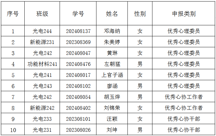 为充分发挥老员工心理工作者在朋辈辅导、同伴教育中的重要作用,持续优化班级、宿舍心理健康环境,强化心理委员的责任担当与服务意识,公司特组织开展2024-2025学年本科生优秀朋辈心理骨干评选,评选结果公示如下: